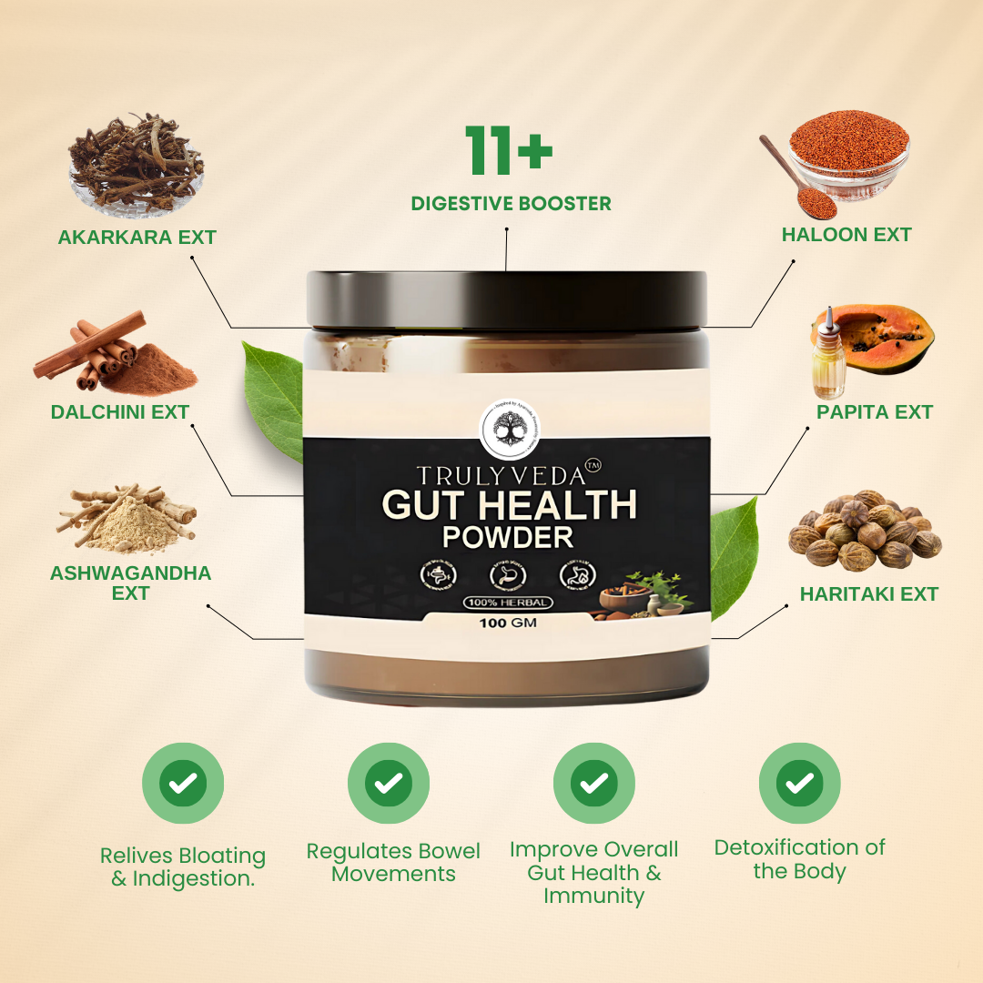 Improve digestion & reduce bloating with TrulyVeda Gut Health Powder, a powerful blend of Triphala & gut-supporting herbs for detox & regularity. B...